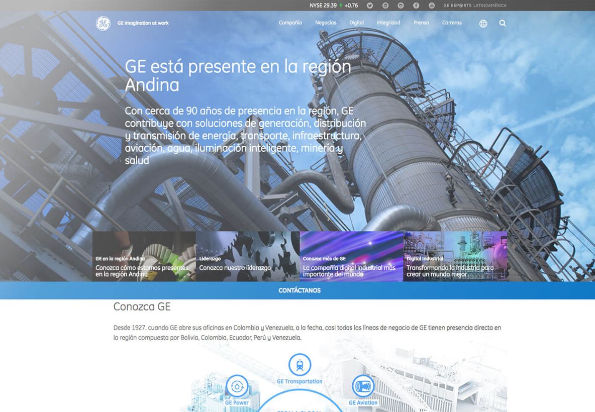 Assim como no site brasileiro, as seções de Negócios (detalhando as áreas de atuação da empresa), Digital (com foco na área industrial digital), Integridad (compromisso com a segurança e a verdade) e Carreras (com o intuito de apresentar oportunidades de emprego na GE) estão presentes. Destaca-se a inclusão da seção Prensa, uma adição recente que oferece notícias que podem ser facilmente cadastradas por meio do ambiente administrável da plataforma.